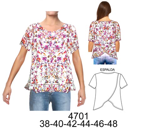 4701 BLUSA CON VUELO DELANTERO Y ESPALDA CRUZADA$9.0$7.0CONSUMO TELA UN COLOR 1.20 METROS APROX. TALLA (46) TELA: CREPE – SEDA – VISCOSAMaterial Choose an optionPapelCarton cortadoPDFTallas Numericas Choose an option384042444648Clear - 4701 BLUSA CON VUELO DELANTERO Y ESPALDA CRUZADA quantity + Add to cart SKU: 4701 Categories: Blouses, Dama Description Additional information DescriptionTabla de medidas ¿Cómo imprimir moldes PDF?Additional informationMaterialPapel, Carton cortado, PDFTallas Numericas38, 40, 42, 44, 46, 48Related products 4713 BLUSA RUEDO AMPLIO, ESPALDA ESCOTADA CON DRAPEADO $9.0$7.0 Select options This product has multiple variants. The options may be chosen on the product page 4715 BLUSA DOBLE VUELO, ESPALDA ESCOTADA $9.0$7.0 Select options This product has multiple variants. The options may be chosen on the product page 4706 BLUSA MANGA 3/4 Y DOBLE FALDON CON VUELO Y AMARRA EN LA ESPALDA $9.0$7.0 Select options This product has multiple variants. The options may be chosen on the product page E94 POLERA CON CUELLO Y CANESU PLIZADO $9.0$7.0 Select options This product has multiple variants. The options may be chosen on the product page