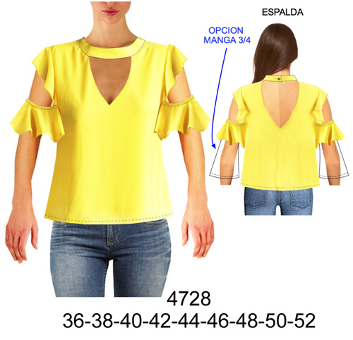 4728 BLUSA SIN HOMBRO CON VUELO, MANGA TIPO RUCHA$9.0$7.0OPCION MANGA 3/4 CONSUMO TELA: 1.50 METROS TALLA 48 APROX TELA: VISCOSA – CREPEMaterial Choose an optionPapelCarton cortadoPDFTallas Numericas Choose an option363840424446485052Clear - 4728 BLUSA SIN HOMBRO CON VUELO, MANGA TIPO RUCHA quantity + Add to cart SKU: 4728 Categories: Blouses, Dama Description Additional information DescriptionTabla de medidas ¿Cómo imprimir moldes PDF?Additional informationMaterialPapel, Carton cortado, PDFTallas Numericas36, 38, 40, 42, 44, 46, 48, 50, 52Related products 4740 BLUSA ESCOTE “V” CON AMARRA, RECOGIDO EN DELANTERO Y ESPALDA MANGA 3/4, DISEÑO HOLGADO $9.0$7.0 Select options This product has multiple variants. The options may be chosen on the product page 4744 BLUSA ESTILO OVERSIZE $9.0$7.0 Select options This product has multiple variants. The options may be chosen on the product page E93 POLERA CON VUELOS MANGA LARGA $9.0$7.0 Select options This product has multiple variants. The options may be chosen on the product page 4723 BLUSA MANGA KIMONO, LARGO ASIMETRICO COSTADO CURVO $9.0$7.0 Select options This product has multiple variants. The options may be chosen on the product page