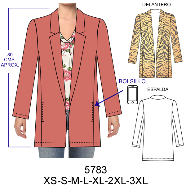 BLAZER SIN FORRO RECTO TIPO SACO$9.0$7.0CONSUMO TELA 1.90 METROS APROX. TALLA (L) TELA: TELAS DELGADAS, VISCOSA, LINOMaterial Choose an optionPapelCarton cortadoPDFTallas Choose an optionXSSMLXL2XL3XLClear - BLAZER SIN FORRO RECTO TIPO SACO quantity + Add to cart SKU: 5783 Categories: Cardigan, Dama, Women's Suits-Jacket Description Additional information DescriptionTabla de medidas ¿Cómo imprimir moldes PDF?Additional informationMaterialPapel, Carton cortado, PDFTallasXS, S, M, L, XL, 2XL, 3XLRelated products 4699 BLUSA ESCOTE ESPALDA EN V CON DOBLE TIRANTES Y HOMBRO DESCUBIERTO $9.0$7.0 Select options This product has multiple variants. The options may be chosen on the product page E93 POLERA CON VUELOS MANGA LARGA $9.0$7.0 Select options This product has multiple variants. The options may be chosen on the product page 4708 BLUSA MANGA KIMONO RUEDO AMPLIO $9.0$7.0 Select options This product has multiple variants. The options may be chosen on the product page 4694 BLUSA CON APLICACION EN MACRAME Y RUEDO AMPLIO $9.0$7.0 Select options This product has multiple variants. The options may be chosen on the product page