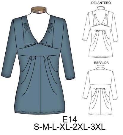 E14 POLERA LARGA MANGA 3/4 CON CORTE BAJO BUSTO$9.0$7.0CONSUMO TELA 1.70 METROS APROX. TALLA (L) TELA :JERSEY LYCRA, LYCRA NYLONMaterial Choose an optionPapelCarton cortadoPDFTallas Choose an optionSMLXL2XL3XLClear - E14 POLERA LARGA MANGA 3/4 CON CORTE BAJO BUSTO quantity + Add to cart SKU: E14 Categories: Dama, Women's T-shirts Description Additional information DescriptionTabla de medidas ¿Cómo imprimir moldes PDF?Additional informationMaterialPapel, Carton cortado, PDFTallasS, M, L, XL, 2XL, 3XLRelated products 4723 BLUSA MANGA KIMONO, LARGO ASIMETRICO COSTADO CURVO $9.0$7.0 Select options This product has multiple variants. The options may be chosen on the product page 4708 BLUSA MANGA KIMONO RUEDO AMPLIO $9.0$7.0 Select options This product has multiple variants. The options may be chosen on the product page 4718 BLUSA RUEDO HOLGADO MANGA 3/4 $9.0$7.0 Select options This product has multiple variants. The options may be chosen on the product page E94 POLERA CON CUELLO Y CANESU PLIZADO $9.0$7.0 Select options This product has multiple variants. The options may be chosen on the product page