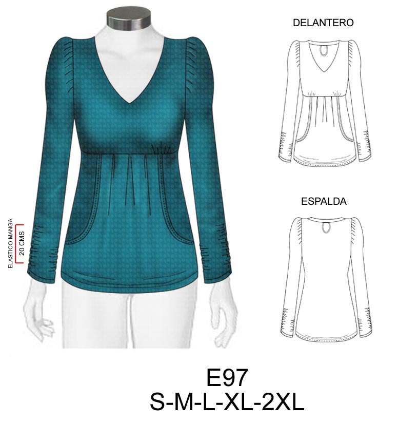 E97 POLERA ESCOTE V CON BOLSILLO PLIZADO, MANGA GLOBO$9.0$7.0CONSUMO TELA 1.50 METROS ( TALLA L) APROX. TELA : JERSEY LYCRA -TELAS ELASTICADASMaterial Choose an optionPapelCarton cortadoPDFTallas Choose an optionSMLXL2XLClear - E97 POLERA ESCOTE V CON BOLSILLO PLIZADO, MANGA GLOBO quantity + Add to cart SKU: E97 Categories: Dama, Women's T-shirts Description Additional information DescriptionTabla de medidas ¿Cómo imprimir moldes PDF?Additional informationMaterialPapel, Carton cortado, PDFTallasS, M, L, XL, 2XLRelated products 4699 BLUSA ESCOTE ESPALDA EN V CON DOBLE TIRANTES Y HOMBRO DESCUBIERTO $9.0$7.0 Select options This product has multiple variants. The options may be chosen on the product page 4713 BLUSA RUEDO AMPLIO, ESPALDA ESCOTADA CON DRAPEADO $9.0$7.0 Select options This product has multiple variants. The options may be chosen on the product page 4710 BLUSA SIN HOMBROS CON VUELO $9.0$7.0 Select options This product has multiple variants. The options may be chosen on the product page E93 POLERA CON VUELOS MANGA LARGA $9.0$7.0 Select options This product has multiple variants. The options may be chosen on the product page